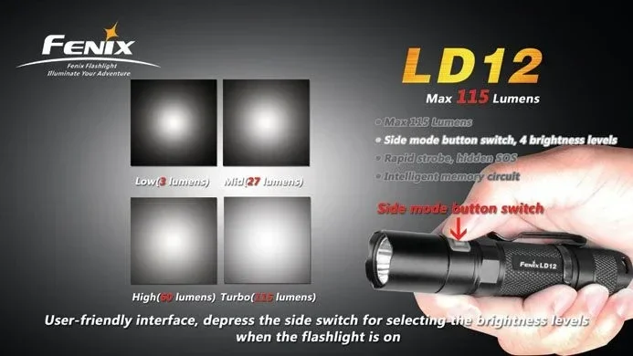 De Fenix LD12 is een hoogwaardig LED-zaklampje dat is uitgerust met een uiterst efficiënte en krachtige Cree XP-G R5 LED. Het lampje heeft 4 lichtstanden (maximaal 115 ANSI* lumen, stroboscoop en S.O.S.) en werkt op 1 AA penlite batterij (alkaline, lithium, of oplaadbare NiMH). De selectieknop voor de verschillende lichtstanden is verwerkt in de lampkop.